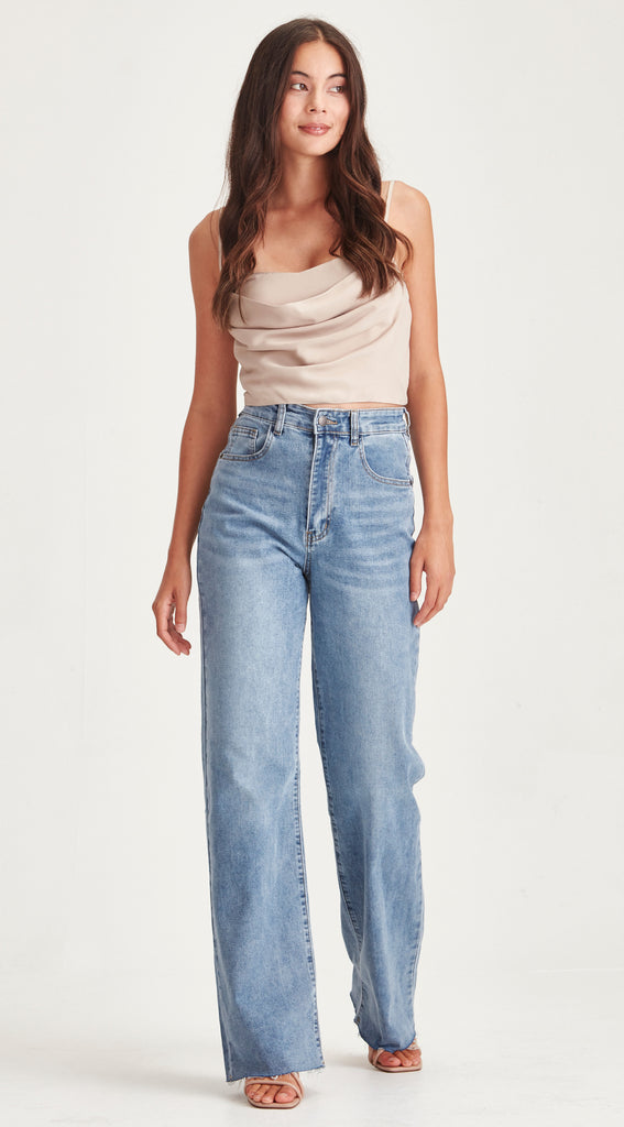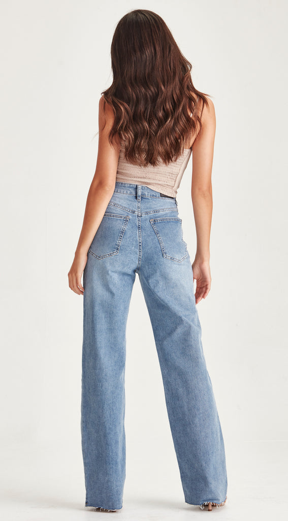 Antigoni is a relaxed fit and super comfy jean in a soft stretch denim, slimmer fit to the waist/body and with a baggier fit leg and raw hem that can be cut to length to suit.