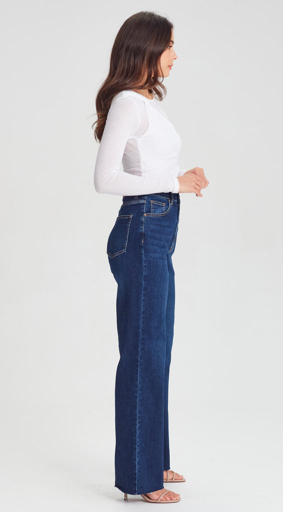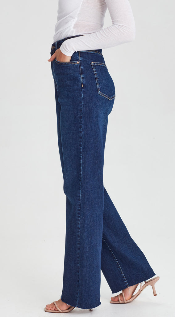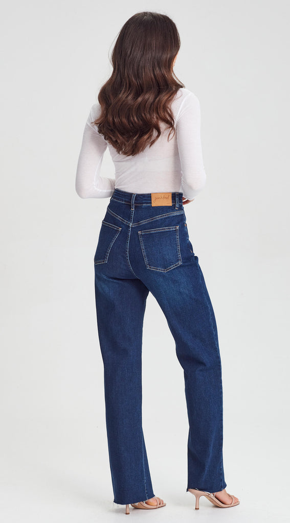 Antigoni is a relaxed fit and super comfy jean in a soft stretch denim, slimmer fit to the waist/body and with a baggier fit leg and raw hem that can be cut to length to suit.