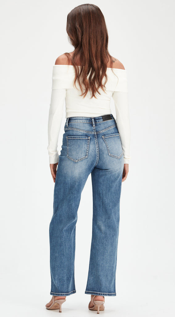 Wendy fits slimmer to the waist & body with a relaxed and wider leg. In a premium stretch denim and perfect denim blue colour.