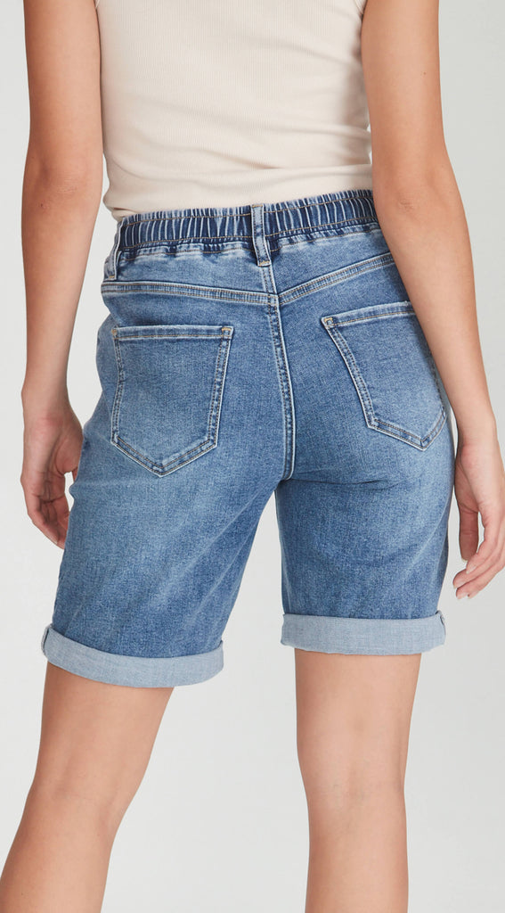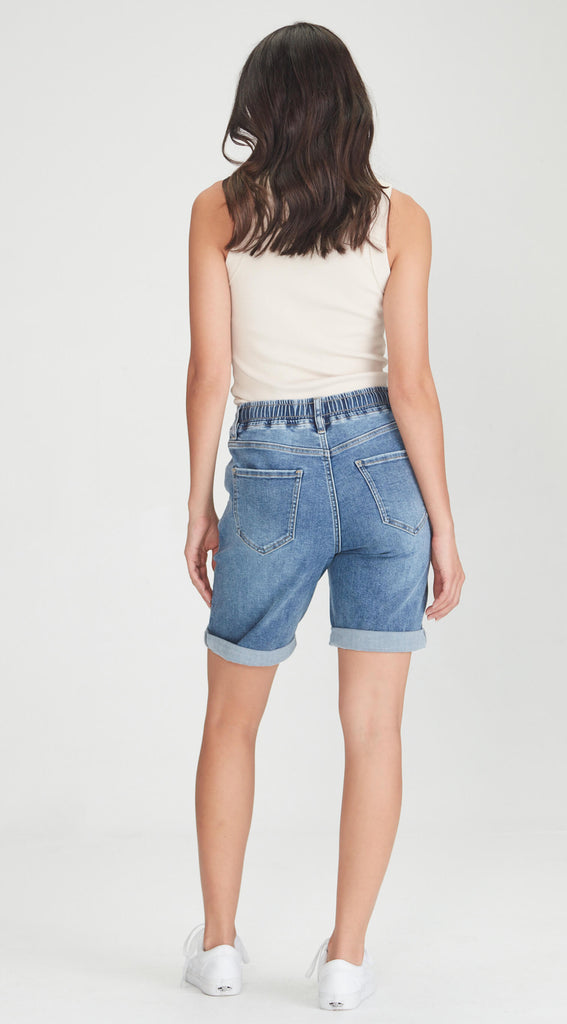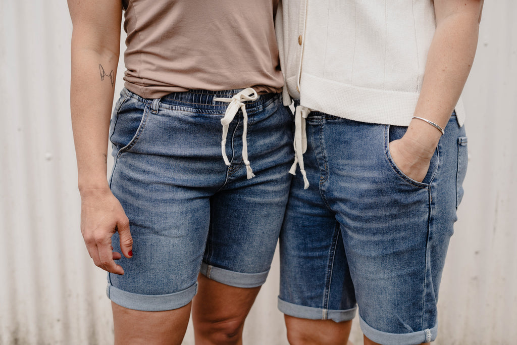 Super soft & comfy premium stretch denim shorts with elasticated waist band and shoe string tie. Can be worn higher or lower on the waist as preferred.