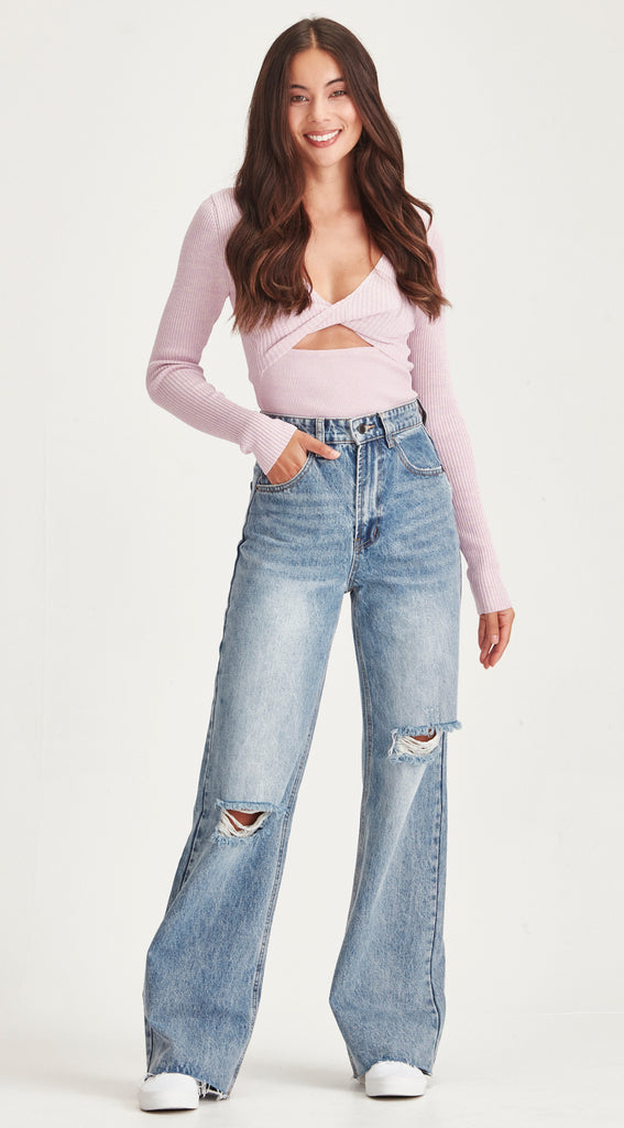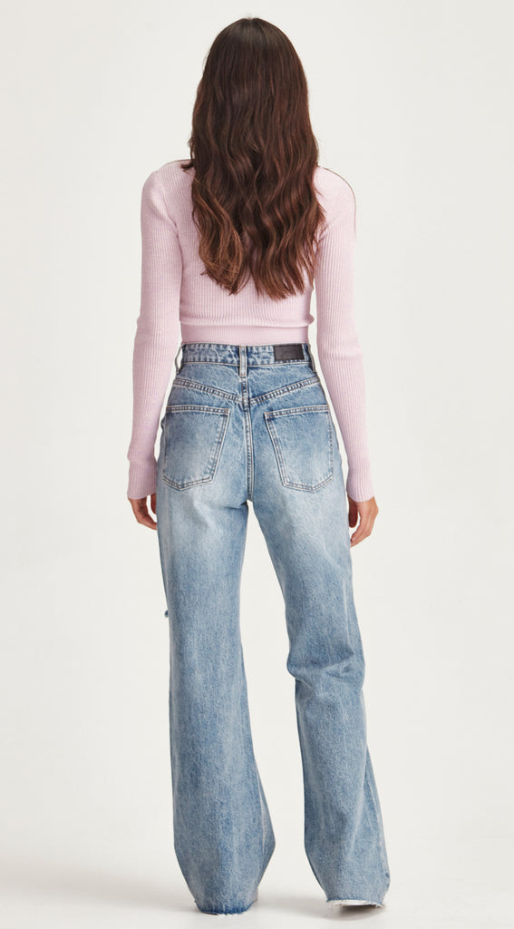 High waisted rigid denim, wide leg jean with knee and thigh rips.