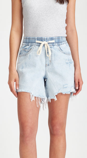 High waisted ripped denim shorts with elastic waist and shoe string tie.