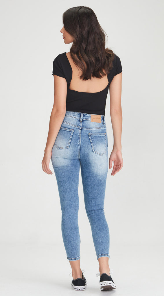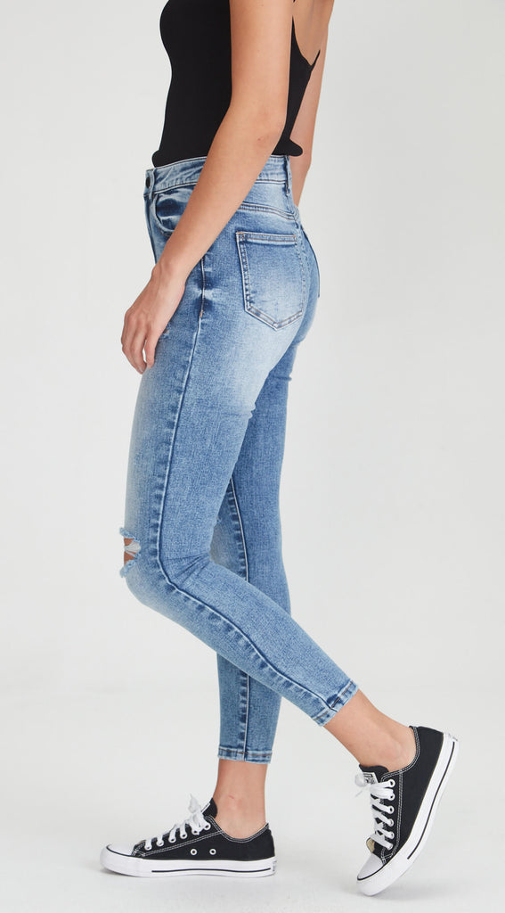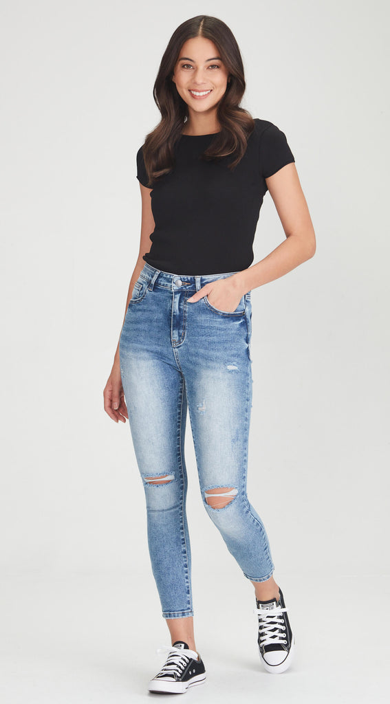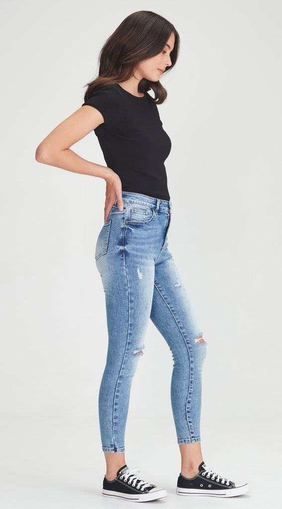 Mid to high waisted stretch denim skinny jean with rips.