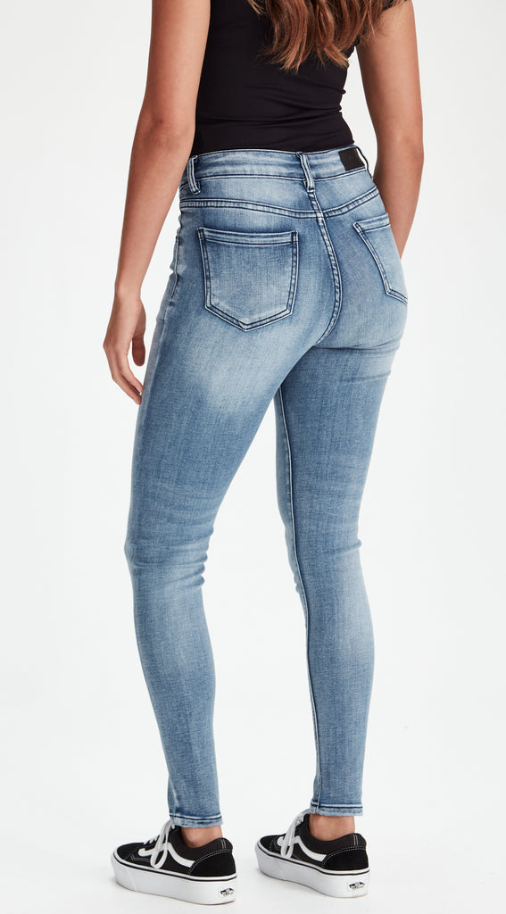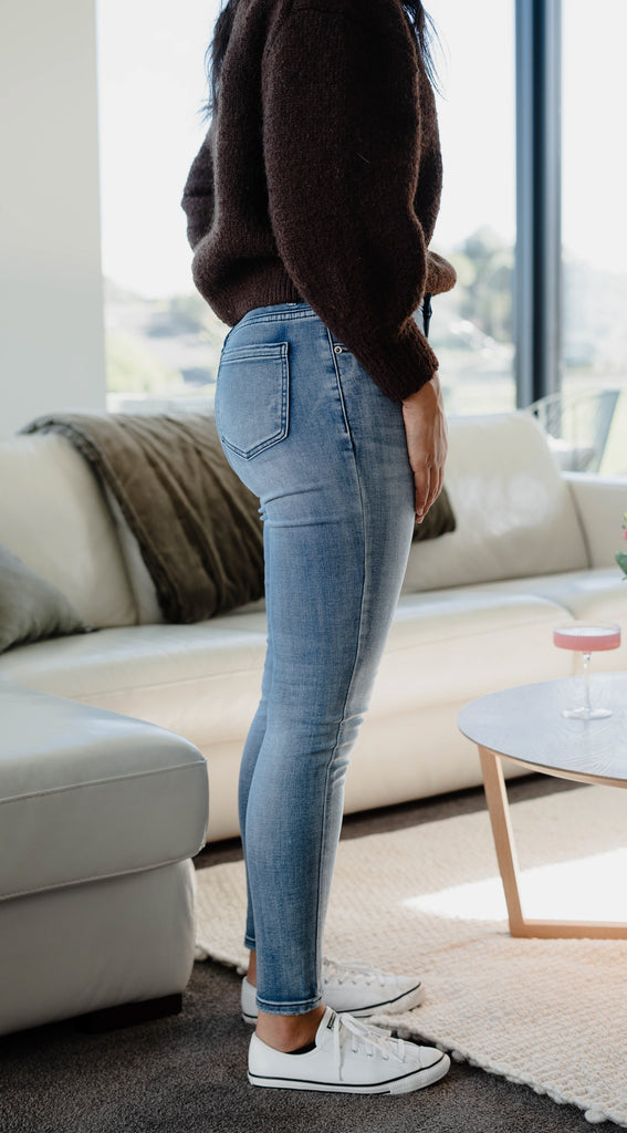 Mid to High waisted stretch denim skinny jean. In a super stretch & comfortable denim which holds firm where it needs to.
