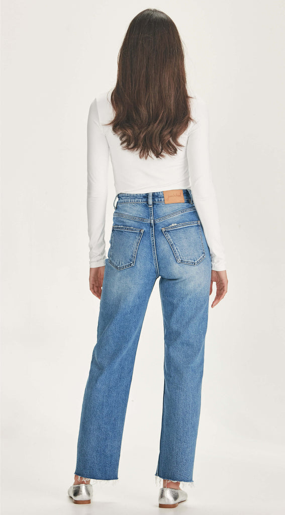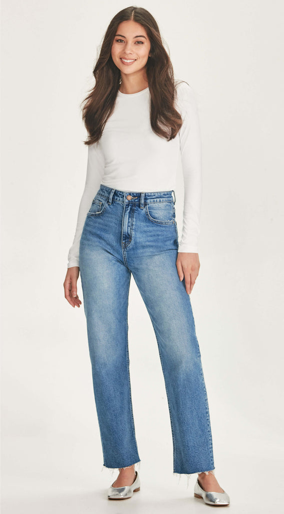 A classic high waisted jean that fits slimmer to the waist & body with a relaxed straight leg design with a raw hem that can be cut to length if needed.