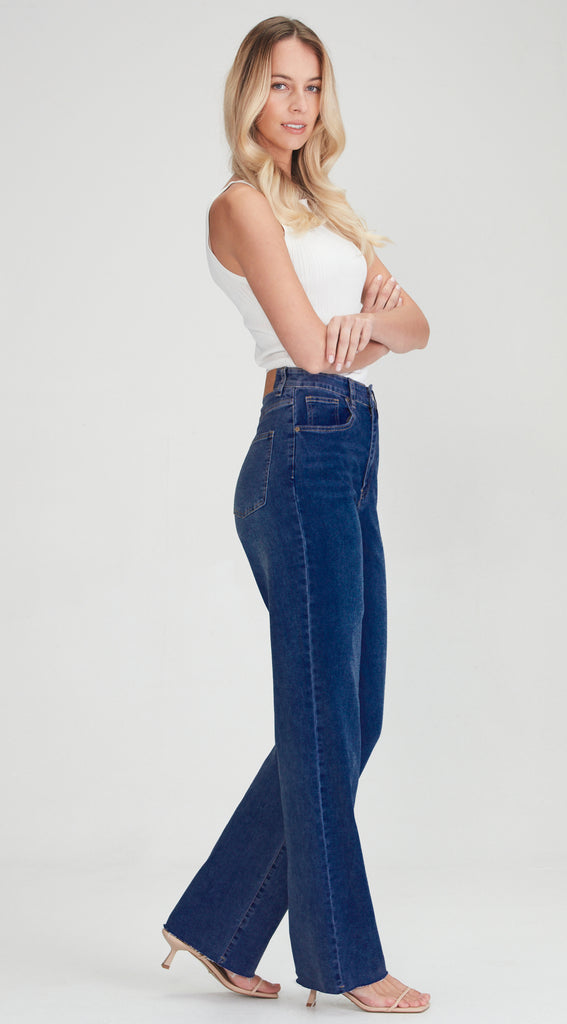 In a high rise straight to wide leg design, with a slimmer fit to the body and a roomier leg fit. In a soft high stretch denim with an unstitched hem that can be cut to length if required.