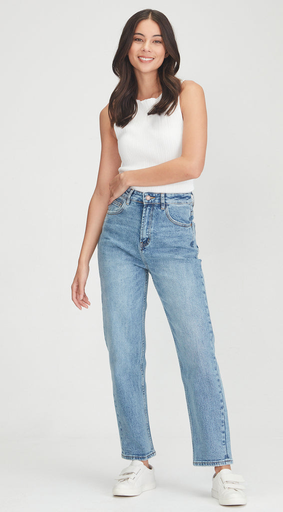 A classic high waisted mom jean that fits slimmer to the waist & body with a relaxed straight leg design. In a comfortable low stretch denim.